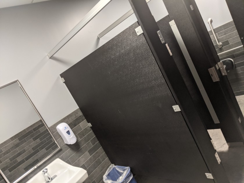 It means running water, soap/sanitizer, and adequate hand drying options. It means gender neutral options. It means enclosed stalls that provide adequate privacy, not huge gaps for folks to peer into. It means containers for proper disposal of used sanitary products and sharps. It means diaper changing tables. It means having ADA door openers. It means free use, without requiring a purchase or fee, or special key tied to a cumbersome object.