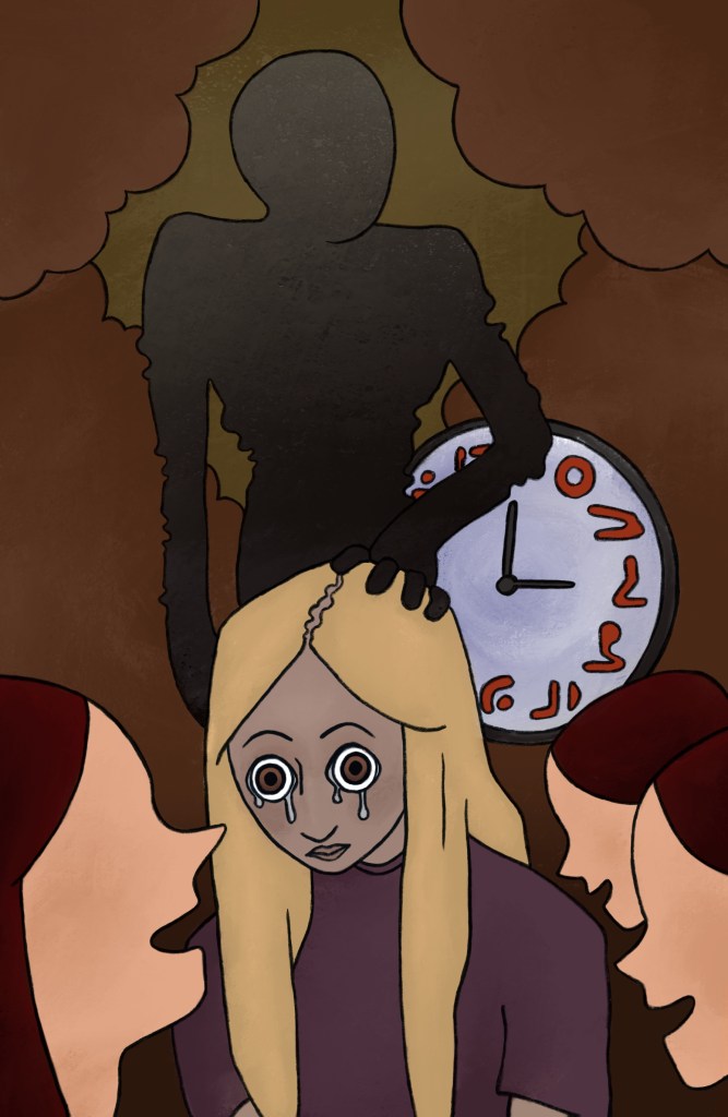 About the artist: My ADHD and anxiety causes me to feel constantly overwhelmed, and this piece represents the weight of several different aspects. I struggle with time blindness and management, and I frequently find myself feeling isolated and behind my peers. I find myself fixated on what I’m “supposed” to be doing, and instead shut down and go into auto-pilot, making me feel lost and out of control. I often don’t feel like myself and am stuck in an internal spiral.