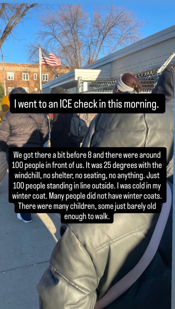 I have been accompanying individuals to their ICE check ins every month since August 2025 when a request was made from the friend of a friend for accompaniment. There is not much you can do in an accompaniment role besides provide support for the person going through the process and being a witness to what they are going through. Today I am honoring my role of witness.