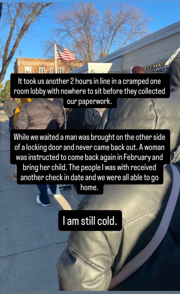 The ICE facility in Grand Forks is not equipped to handle the appointment demand. This is not a new problem and has been occurring for years. People who are required to check in at this building are forced to stand outside for hours at a time without shelter from the elements or a place to rest. I have seen elderly folks, children, infants, a man in a full leg brace, people without coats or hats or mittens, all forced to wait in line outside in freezing temperatures for hours at a time with no ability to address this inhumane treatment. The nature of these check-ins creates a power dynamic that prevents anything but compliance with the system from those going through it.