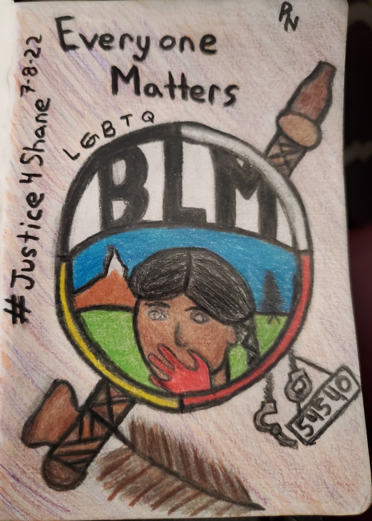 Shane Netterville, an unarmed Indigenous man, was shot and killed by Fargo Police on July 8, 2022. His loved ones and supporters have been working for justice ever since. His brother Ryan has created many art pieces to honor Shane’s life. Ryan says, “I wish I knew why I drew this, but I don’t. Maybe sadness, broken heart. Whatever it is, sometimes randomly I’ll grab my pencil and see what happens, I guess. Everyone matters, including my brother Shane.”